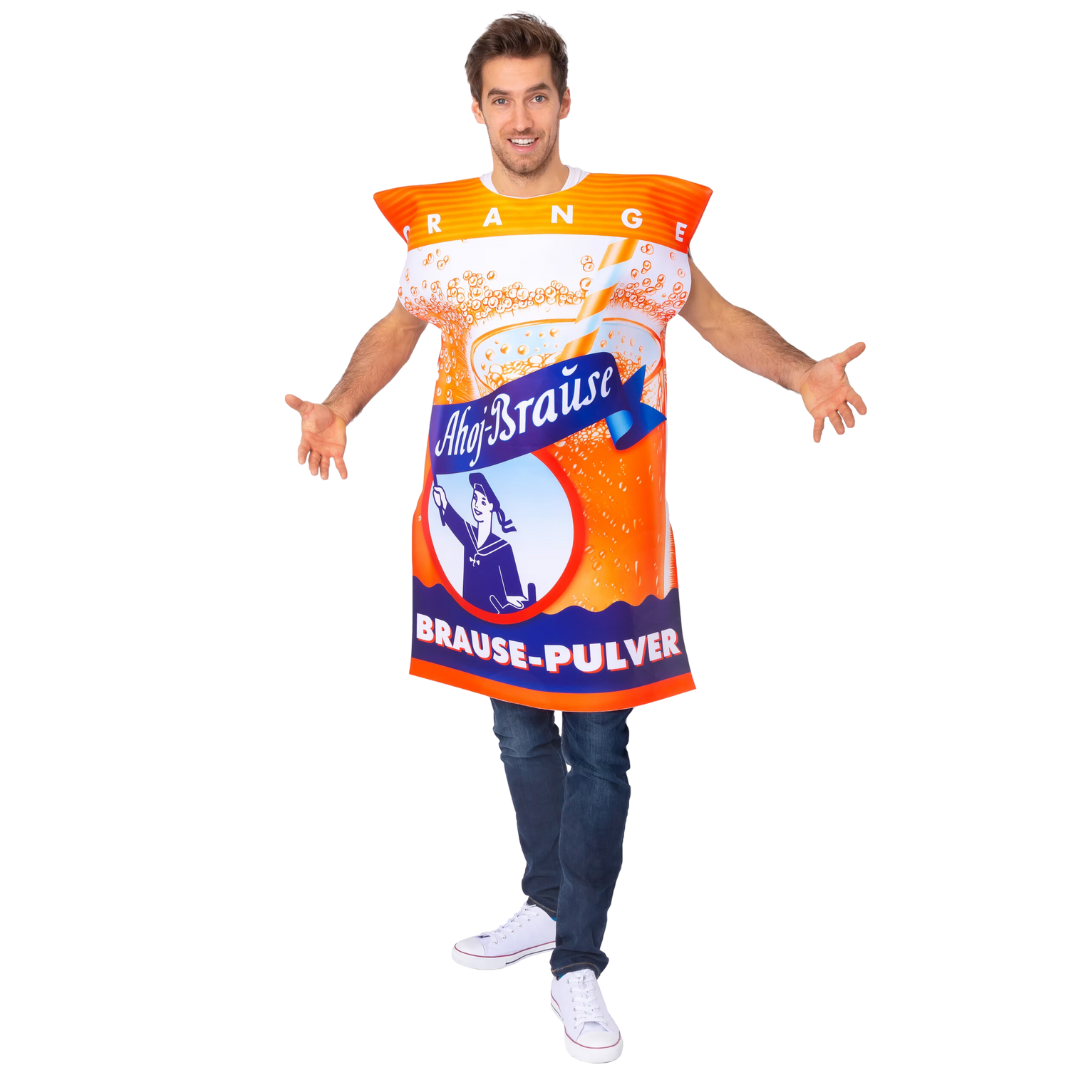 Du hast richtig gesehen: Unser Klassiker, das Ahoj-Brause Pulver Tütchen, gibt es jetzt auch als Kostüm. Mit diesem extravaganten Kostüm für Damen und Herren drehst Du die Zeit zurück und verwandelst Dich pünktlich zu Karneval in eine Prickelbrause mit Orangengeschmack! 🍊