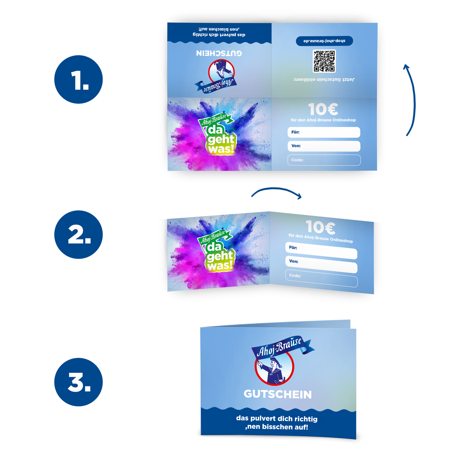 Du bekommst den Gutschein ganz einfach per E-Mail von uns zugeschickt. Anschließend kannst du den Gutschein ausdrucken, ausschneiden, falten und an die Liebsten verschenken. Der Gutscheincode ist bei uns im Onlineshop im Checkout jederzeit einlösbar. Viel Spaß mit deinem Geschenk! 😊